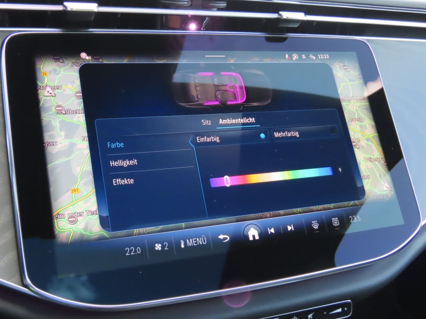 The interior of the vehicle features soft lighting that creates a pleasant atmosphere while driving. This ambient lighting can often be customized with different color options to match your mood or preference.