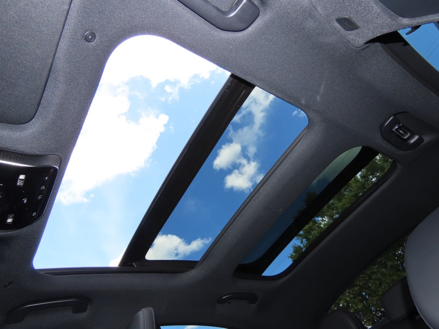 A large glass roof that extends across most or all of the vehicle's ceiling, offering passengers an open, airy feeling and spectacular views of the sky above while driving.