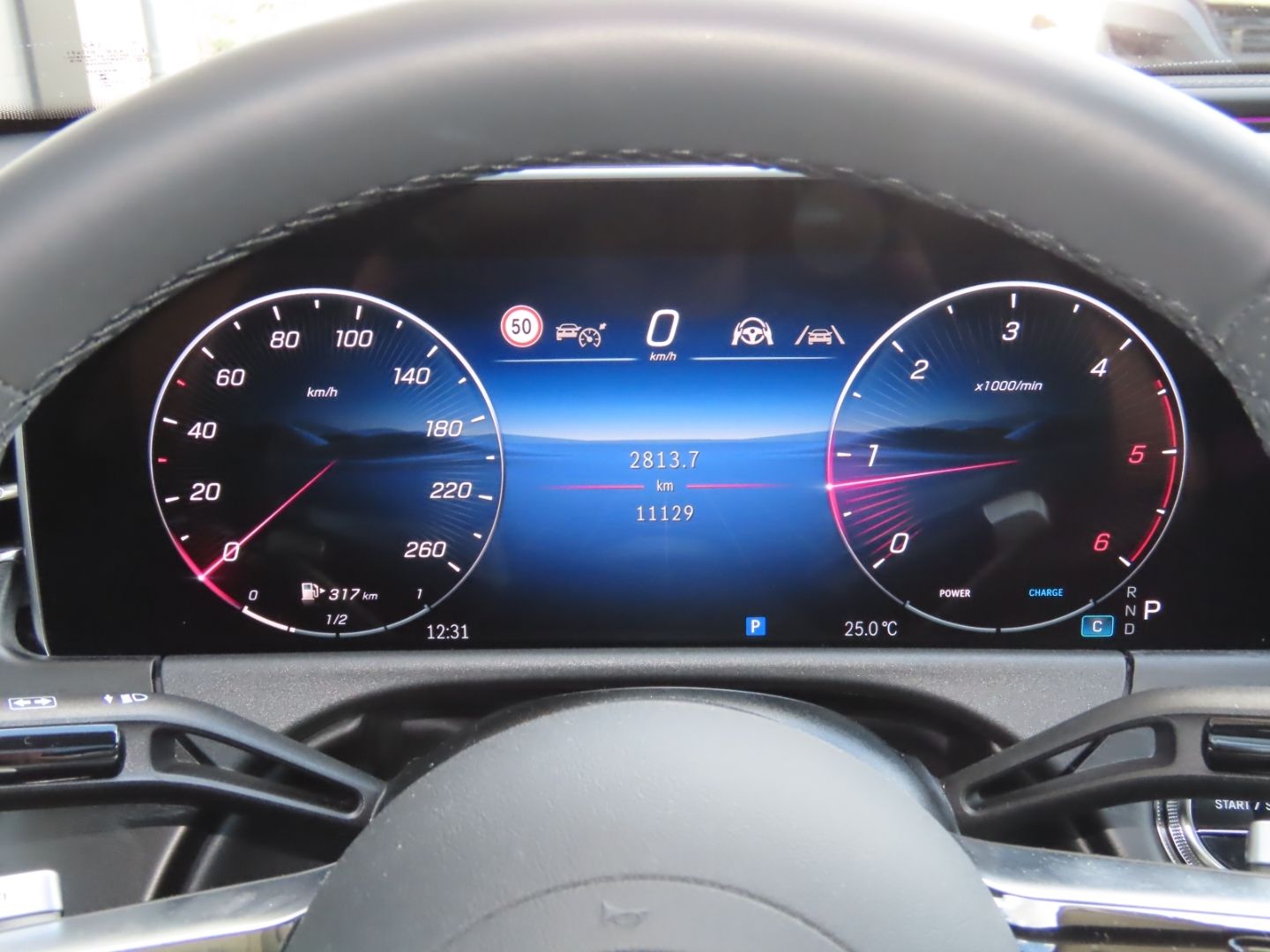 The instrument cluster behind the steering wheel is fully digital, displaying all driving information on a customizable screen rather than traditional analog gauges.